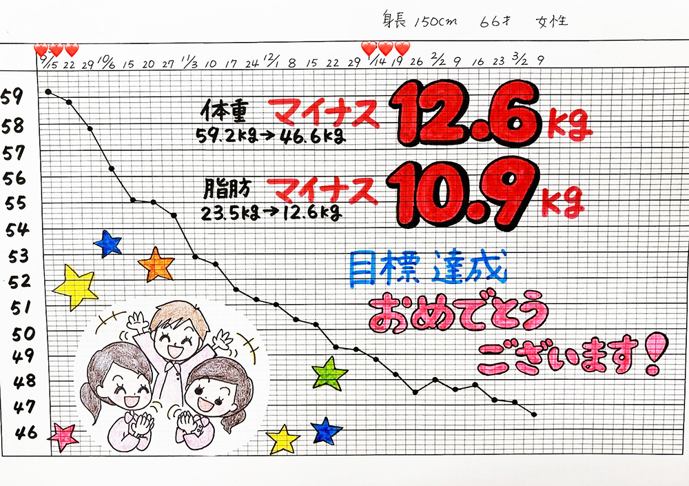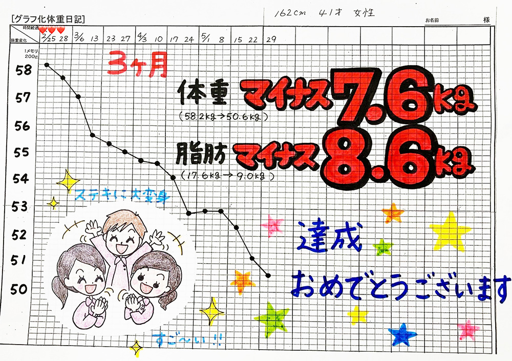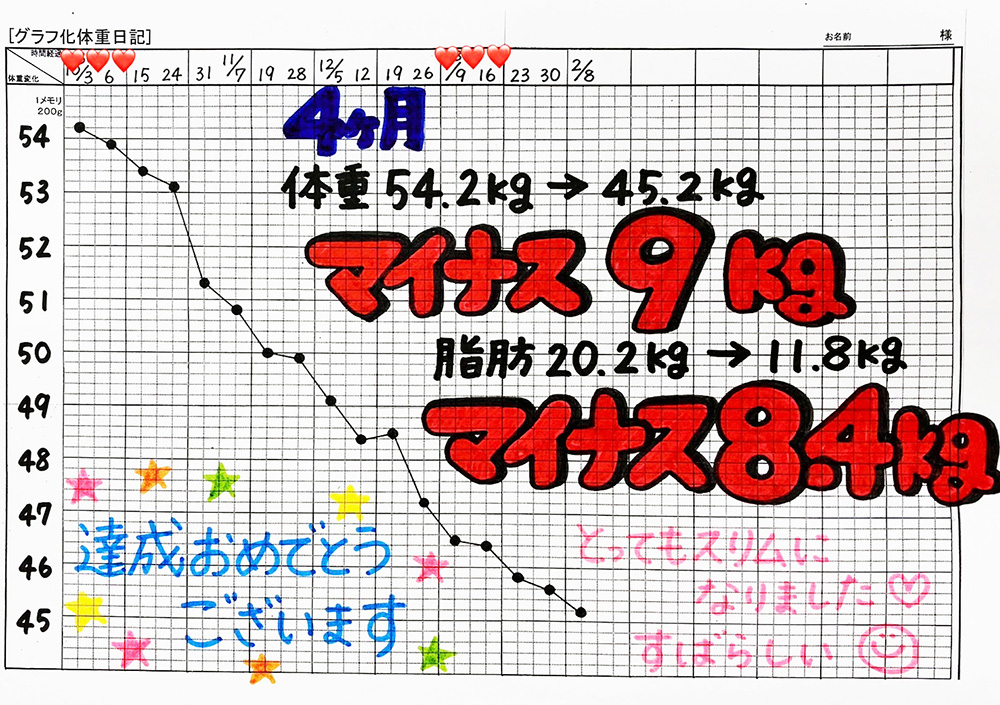 効果には個人差がありますが、平均すると3ヶ月で8〜10kgのペースで痩せる方が多いです。